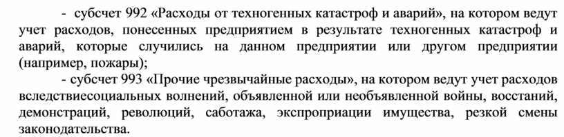 - субсчет 993 «Прочие чрезвычайные расходы», на котором ведут учет расходов вследствие социальных волнений, объявленной или необъявленной войны, восстаний, демонстраций, революций, саботажа, экспроприации имущества, резкой смены законодательства.