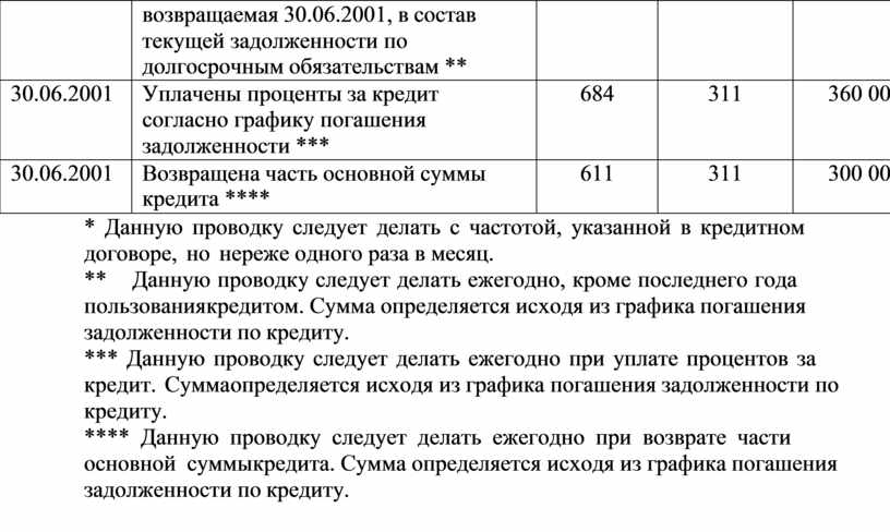 **** Данную проводку следует делать ежегодно при возврате части основной суммы кредита. Сумма определяется исходя из графика погашения задолженности по кредиту.
