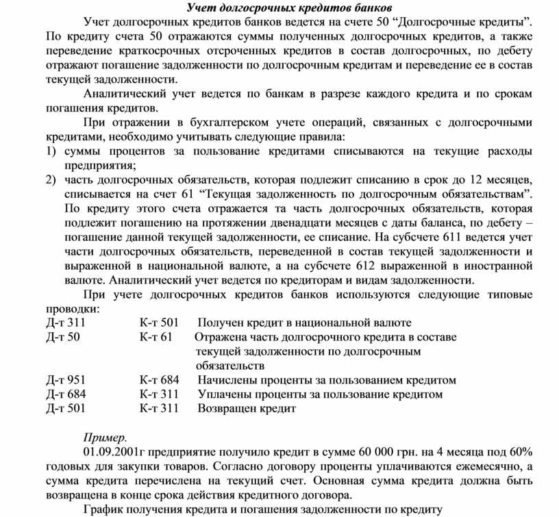 Учет долгосрочных кредитов банков ведется на счете 50 “Долгосрочные кредиты”. По кредиту счета 50 отражаются суммы полученных долгосрочных кредитов, а также переведение краткосрочных отсроченных кредитов в состав долгосрочных, по дебету отражают погашение задолженности по долгосрочным кредитам и переведение ее в состав текущей задолженности.