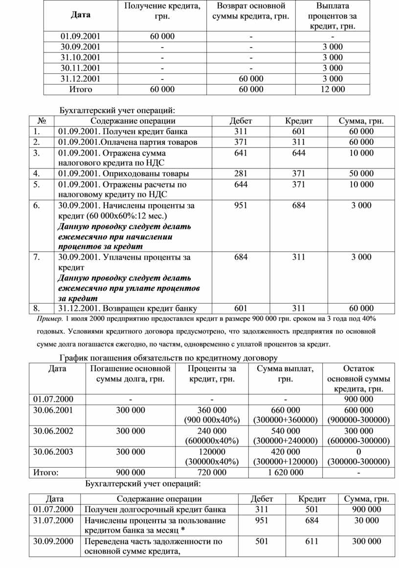 01.09.2001г предприятие получило кредит в сумме 60 000 грн. на 4 месяца под 60% годовых для закупки товаров. Согласно договору проценты уплачиваются ежемесячно, а сумма кредита перечислена на текущий счет. Основная сумма кредита должна быть возвращена в конце срока действия кредитного договора.