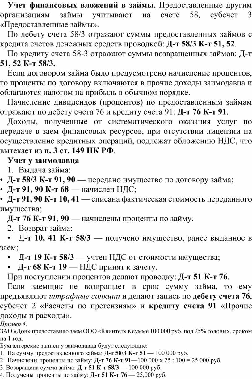 Учет финансовых вложений в займы. Предоставленные другим организациям займы учитывают на счете 58, субсчет 3 «Предоставленные займы».