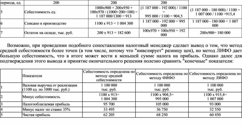 Возможно, при проведении подобного сопоставления налоговый менеджер сделает вывод о том, что метод средней себестоимости более точен (в том числе, потому что "нивелирует" разницу цен), но метод ЛИФО дает большую себестоимость, что в итоге может вести к меньшей сумме налога на прибыль. Однако далее для подтверждения этого вывода и принятие окончательного решения полезно сравнить "конечные" показатели: