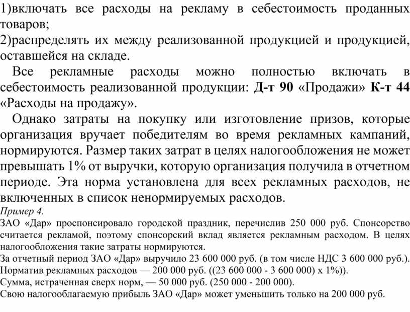 За отчетный период ЗАО «Дар» выручило 23 600 000 руб. (в том числе НДС 3 600 000 руб.). Норматив рекламных расходов — 200 000 руб. ((23 600 000 - 3 600 000) х 1%)).
