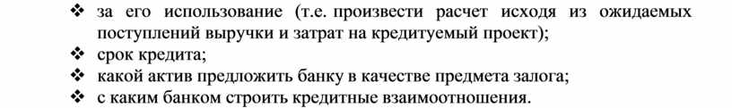 v за его использование (т.е. произвести расчет исходя из ожидаемых поступлений выручки и затрат на кредитуемый проект);