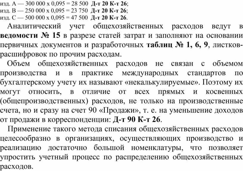 Применение такого метода списания общехозяйственных расходов целесообразно в организациях, осуществляющих производство и реализацию достаточно большой номенклатуры, что позволяет упростить учетный процесс по распределению общехозяйственных расходов.