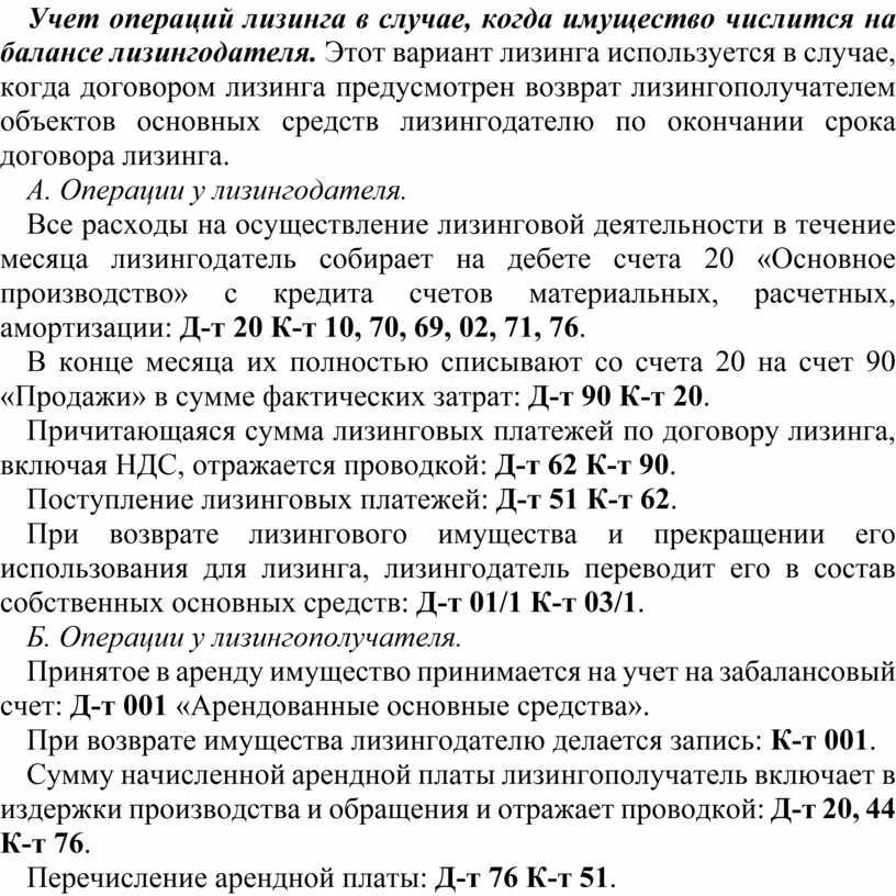 Учет операций лизинга в случае, когда имущество числится на балансе лизингодателя. Этот вариант лизинга используется в случае, когда договором лизинга предусмотрен возврат лизингополучателем объектов основных средств лизингодателю по окончании срока договора лизинга.