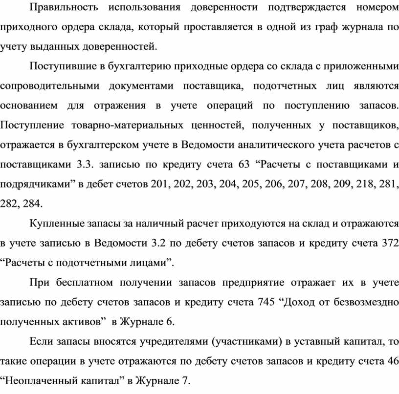 Если предприятие-покупатель получает запасы у поставщика непосредственно с его склада, то своему представителю выдается доверенность на право получения таких запасов. Доверенность является бланком строгой отчетности, выдается бухгалтерией под расписку, предварительно зарегистрировав в специальном журнале по учету выдачи и использования бланков доверенностей.