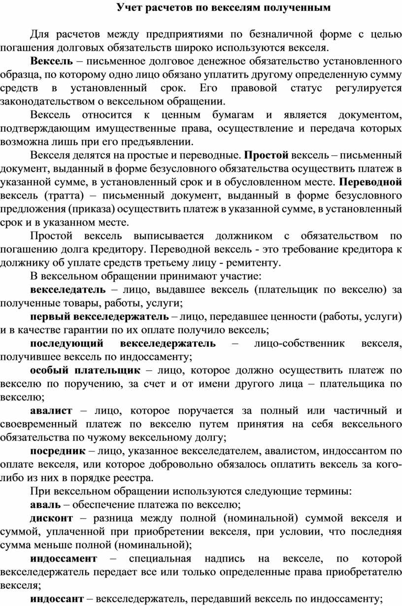 По дебету этих счетов отражается получение векселя за проданные товары (работы, услуги) и по другим операциям, а по кредиту – полученные денежные средства в погашение векселей, погашение полученным векселем кредиторской задолженности, продажа векселя третьей стороне и т. д. Дебетовое сальдо показывает сумму задолженности покупателей, заказчиков и прочих дебиторов, обеспеченную векселями.