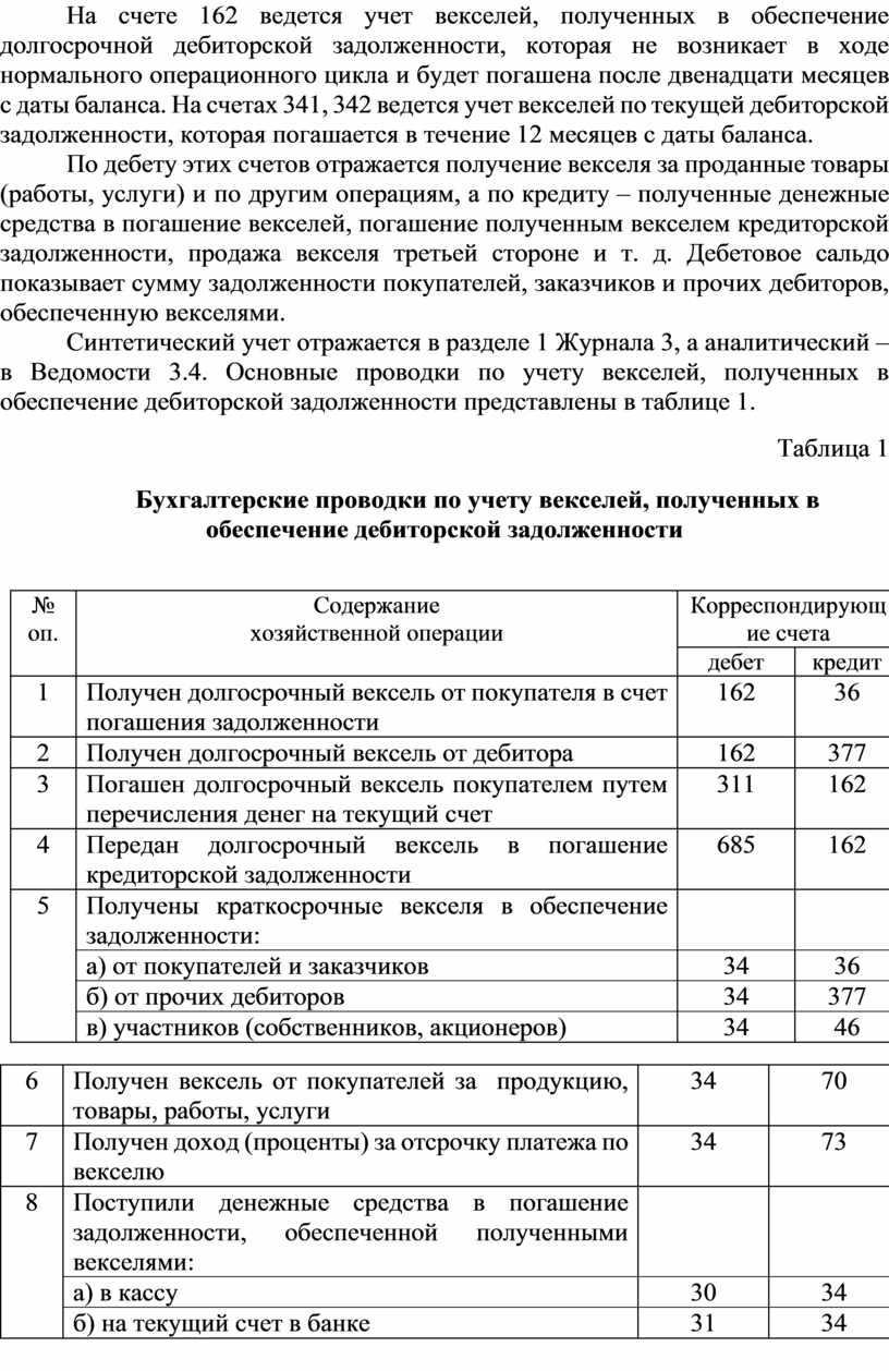 Синтетический учет отражается в разделе 1 Журнала 3, а аналитический – в Ведомости 3.4. Основные проводки по учету векселей, полученных в обеспечение дебиторской задолженности представлены в таблице 1.