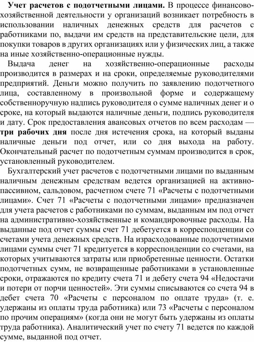 Бухгалтерский учет расчетов с подотчетными лицами по выданным наличным денежным средствам ведется организацией на активно-пассивном, сальдовом, расчетном счете 71 «Расчеты с подотчетными лицами». Счет 71 «Расчеты с подотчетными лицами» предназначен для учета расчетов с работниками по суммам, выданным им под отчет на административно-хозяйственные и командировочные расходы. На выданные под отчет суммы счет 71 дебетуется в корреспонденции со счетами учета денежных средств. На израсходованные подотчетными лицами суммы счет 71 кредитуется в корреспонденции со счетами, на которых учитываются затраты или приобретенные ценности. Остатки подотчетных сумм, не возвращенные работниками в установленные сроки, отражаются по кредиту счета 71 и дебету счета 94 «Недостачи и потери от порчи ценностей». Эти суммы списываются со счета 94 в дебет счета 70 «Расчеты с персоналом по оплате труда» (т. е. удержаны из оплаты труда работника) или 73 «Расчеты с персоналом по прочим операциям» (когда они не могут быть удержаны из оплаты труда работника). Аналитический учет по счету 71 ведется по каждой сумме, выданной под отчет.