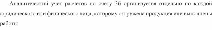 Аналитический учет расчетов по счету 36 организуется отдельно по каждой юридического или физического лица, которому отгружена продукция или выполнены работы