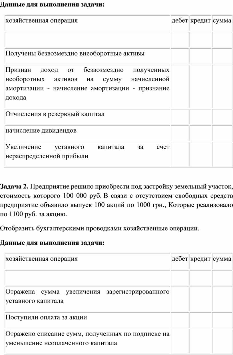 Задача 2. Предприятие решило приобрести под застройку земельный участок, стоимость которого 100 000 руб. В связи с отсутствием свободных средств предприятие объявило выпуск 100 акций по 1000 грн., Которые реализовало по 1100 руб. за акцию.