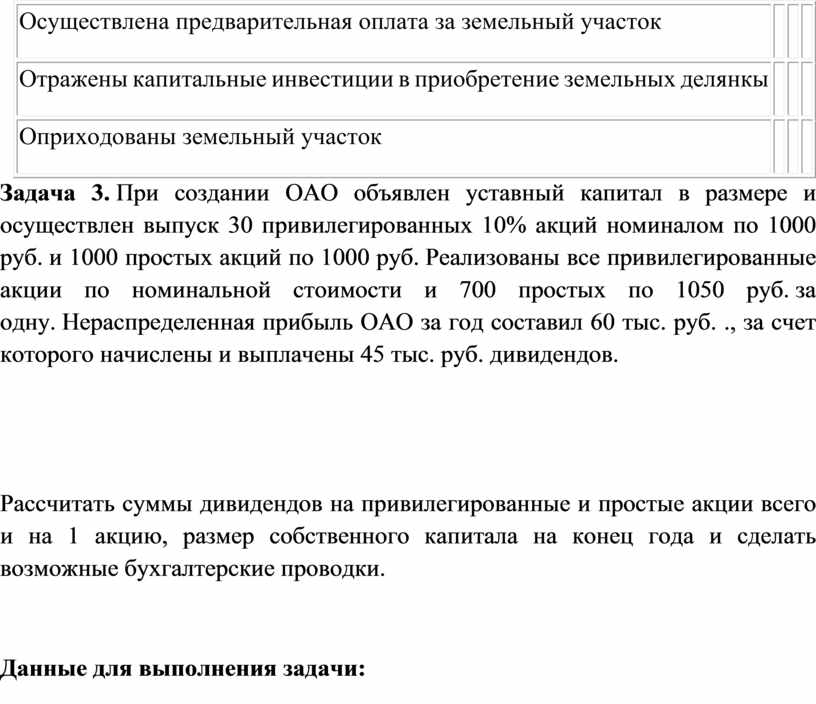 Задача 3. При создании ОАО объявлен уставный капитал в размере и осуществлен выпуск 30 привилегированных 10% акций номиналом по 1000 руб. и 1000 простых акций по 1000 руб. Реализованы все привилегированные акции по номинальной стоимости и 700 простых по 1050 руб. за одну. Нераспределенная прибыль ОАО за год составил 60 тыс. руб. ., за счет которого начислены и выплачены 45 тыс. руб. дивидендов.