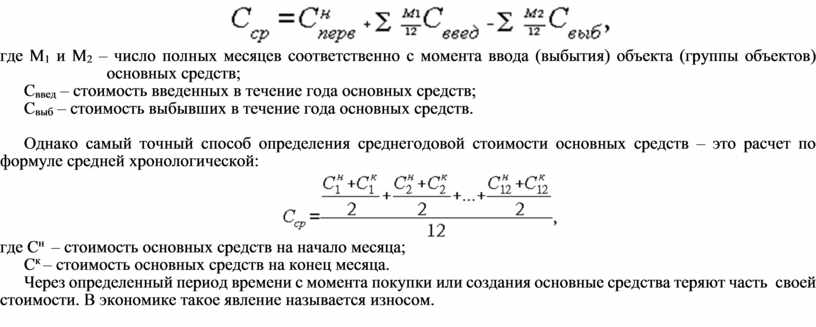 Но ввод – вывод основных средств в течение года идет неравномерно, поэтому предложенный выше способ дает приблизительный результат. Для более точного определения среднегодовой стоимости основных средств применяется формула, которая учитывает месяц ввода – вывода: