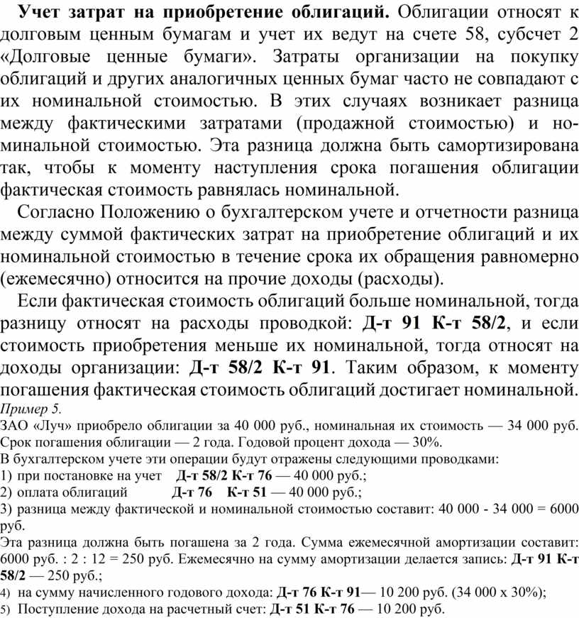Учет затрат на приобретение облигаций. Облигации относят к долговым ценным бумагам и учет их ведут на счете 58, субсчет 2 «Долговые ценные бумаги». Затраты организации на покупку облигаций и других аналогичных ценных бумаг часто не совпадают с их номинальной стоимостью. В этих случаях возникает разница между фактическими затратами (продажной стоимостью) и номинальной стоимостью. Эта разница должна быть самортизирована так, чтобы к моменту наступления срока погашения облигации фактическая стоимость равнялась номинальной.