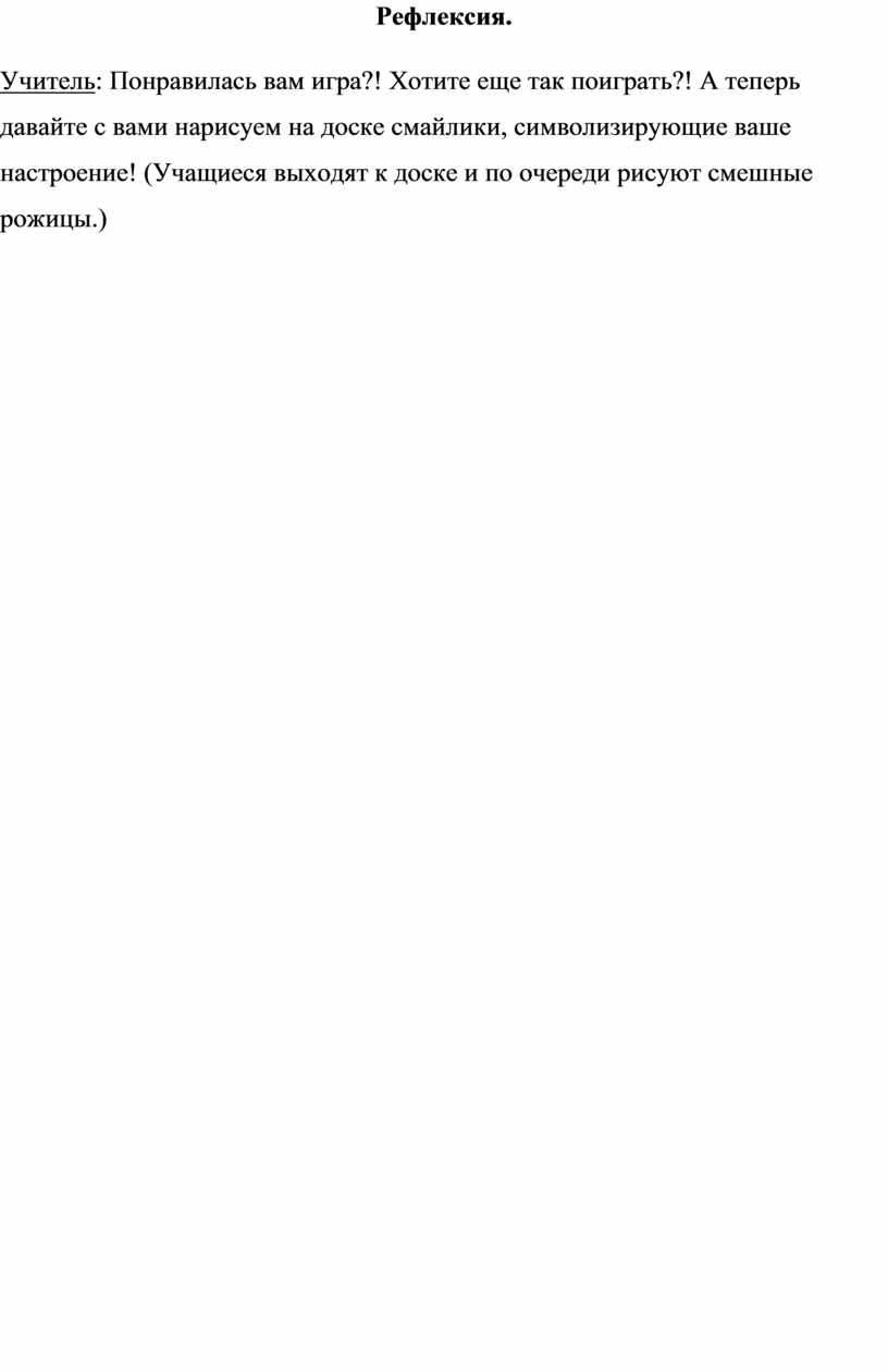 Учитель: Понравилась вам игра?! Хотите еще так поиграть?! А теперь давайте с вами нарисуем на доске смайлики, символизирующие ваше настроение! (Учащиеся выходят к доске и по очереди рисуют смешные рожицы.)