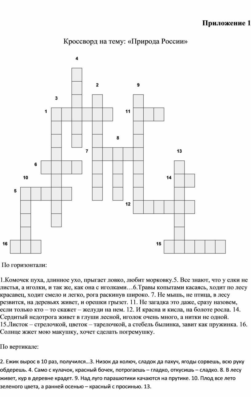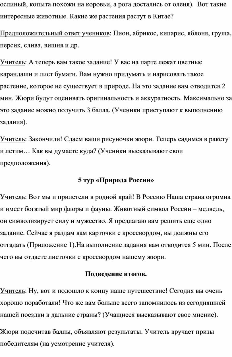 Учитель: Вот мы и прилетели в родной край! В Россию Наша страна огромна и имеет богатый мир флоры и фауны. Животный символ России – медведь, он символизирует силу и мужество. Я предлагаю вам решить еще одно задание. Сейчас я раздам вам карточки с кроссвордом, вы должны его отгадать (Приложение 1).На выполнение задания вам отводится 5 мин. После чего вы отдаете листочки с кроссвордом нашему жюри.