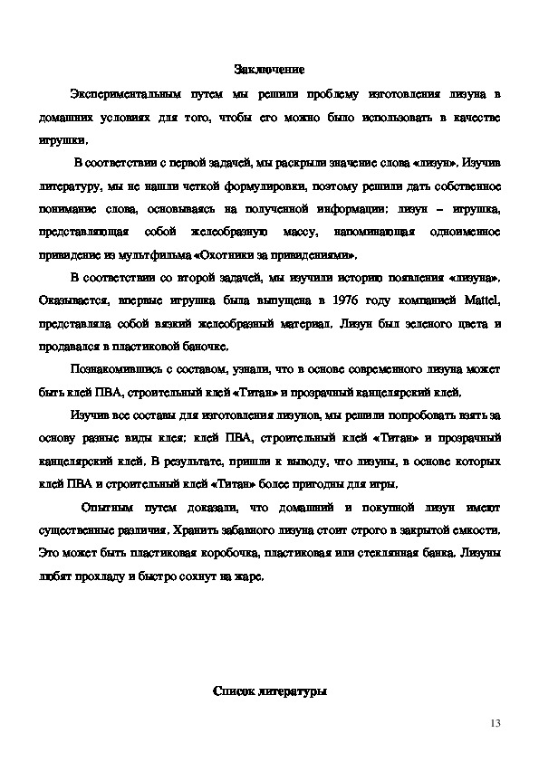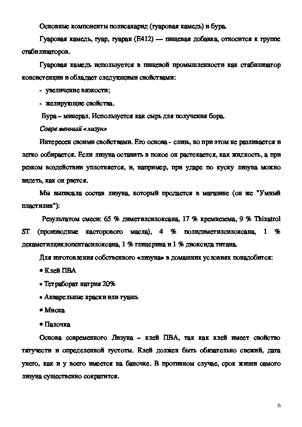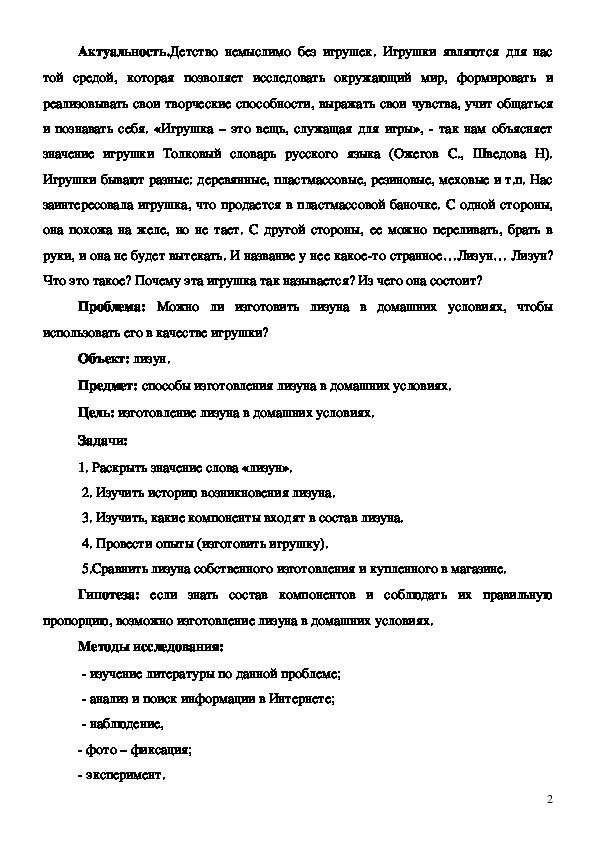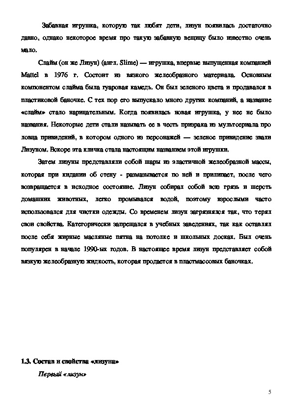 Удивительный лизун.Детство немыслимо без игрушек. Игрушки являются для нас той средой, которая позволяет исследовать окружающий мир, формировать и реализовывать свои творческие способности, выражать свои чувства, учит общаться и познавать себя. «Игрушка – это вещь, служащая для игры», - так нам объясняет значение игрушки Толковый словарь русского языка (Ожегов С., Шведова Н). Игрушки бывают разные: деревянные, пластмассовые, резиновые, меховые и т.п. Нас заинтересовала игрушка, что продается в пластмассовой баночке. С одной стороны, она похожа на желе, но не тает. С другой стороны, ее можно переливать, брать в руки, и она не будет вытекать. И название у нее какое-то странное…Лизун… Лизун? Что это такое? Почему эта игрушка так называется? Из чего она состоит?