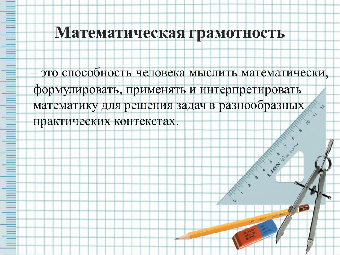 – это способность человека мыслить математически, формулировать, применять и интерпретировать математику для решения задач в разнообразных практических контекстах.