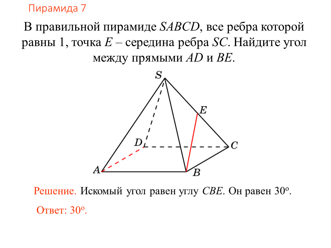 В правильной пирамиде SABCD, все ребра которой равны 1, точка E – середина ребра SC. Найдите угол между прямыми AD и BE.