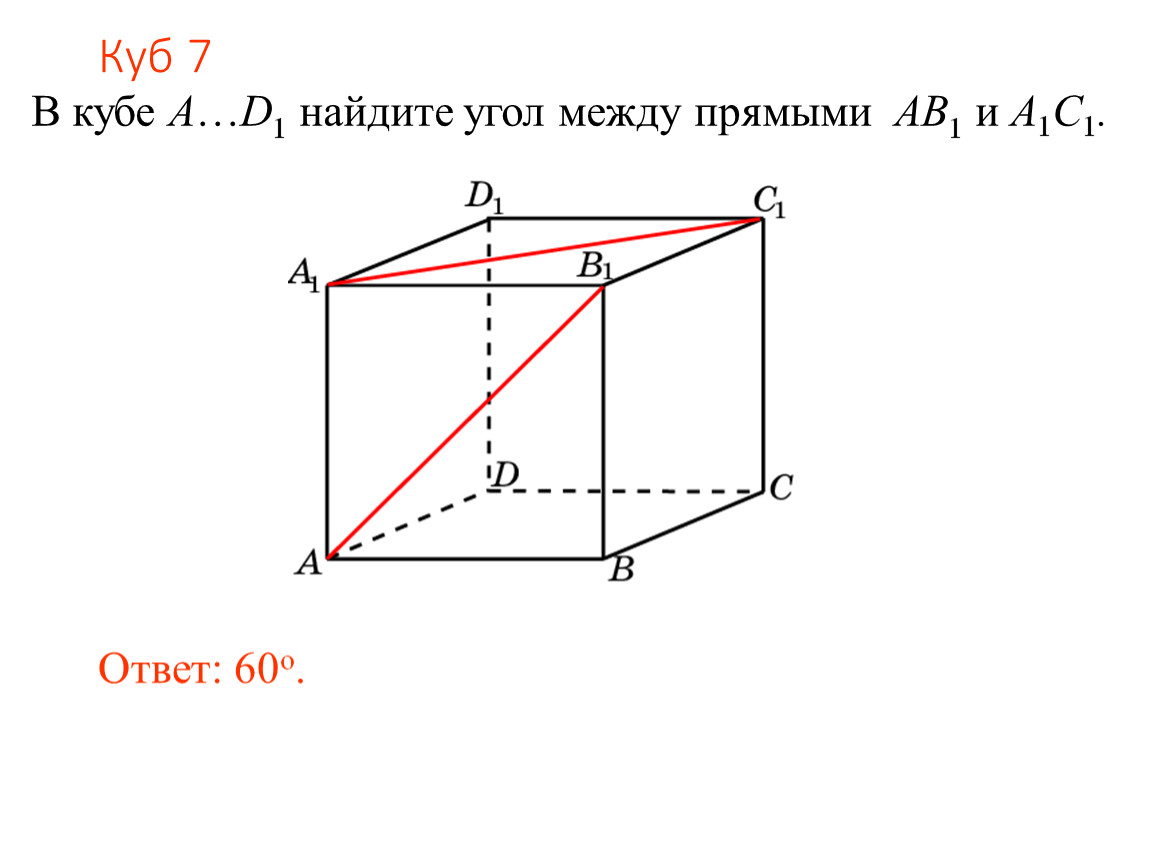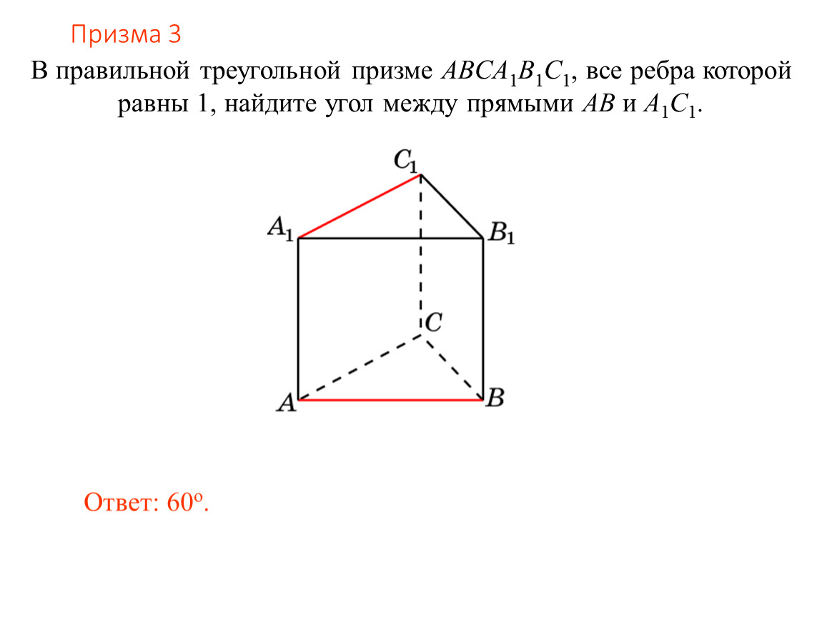 В правильной треугольной призме ABCA1B1C1, все ребра которой равны 1, найдите угол между прямыми AB и A1C1.