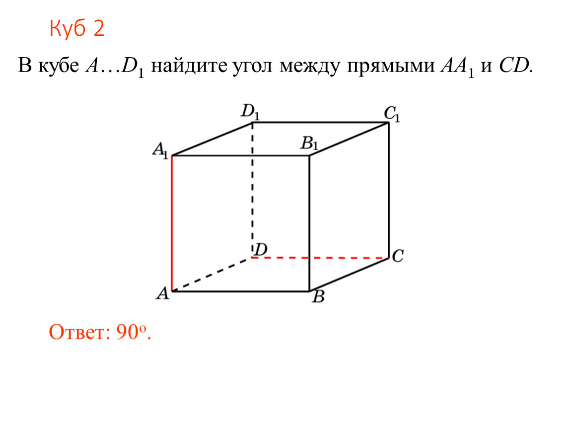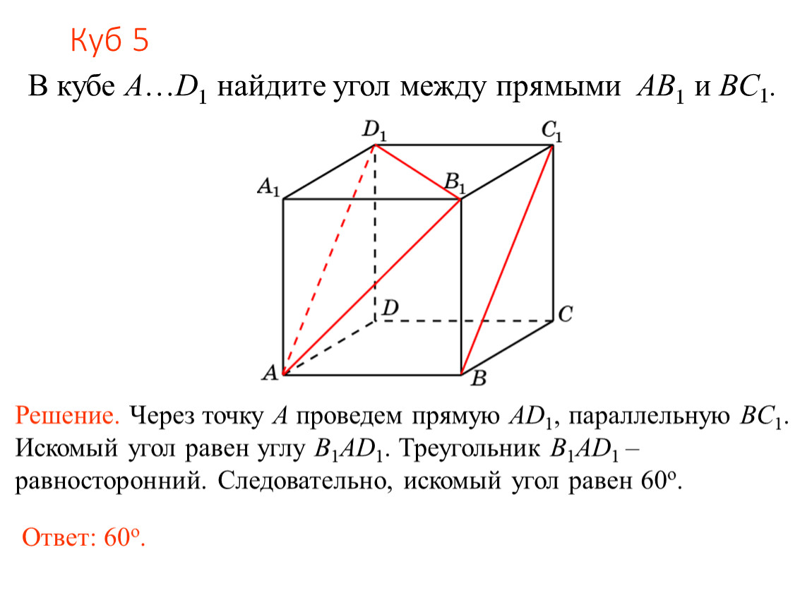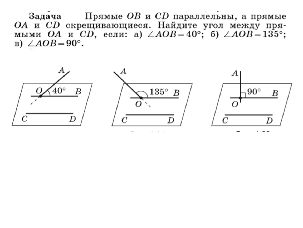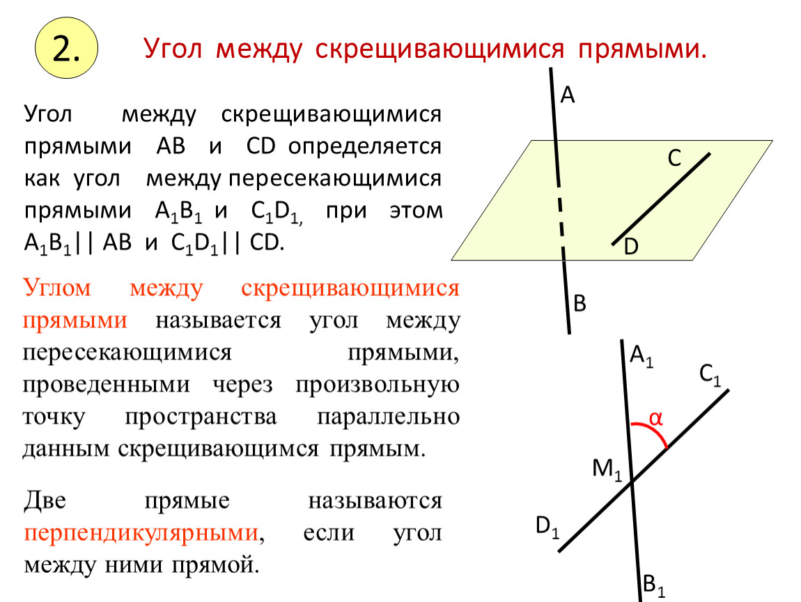 Угол между скрещивающимися прямыми АВ и СD определяется как угол между пересекающимися прямыми А1В1 и С1D1, при этом А1В1|| АВ и С1D1|| CD.