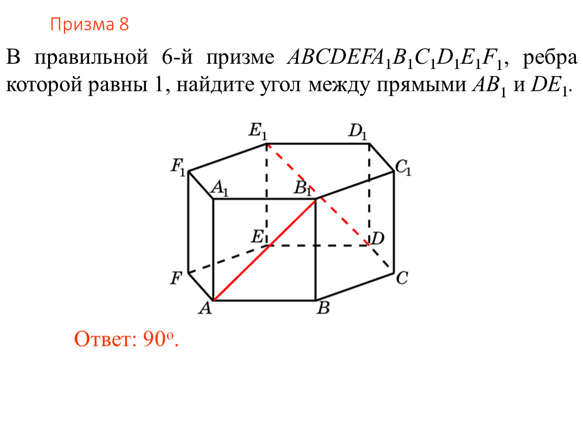 В правильной 6-й призме ABCDEFA1B1C1D1E1F1, ребра которой равны 1, найдите угол между прямыми AB1 и DE1.