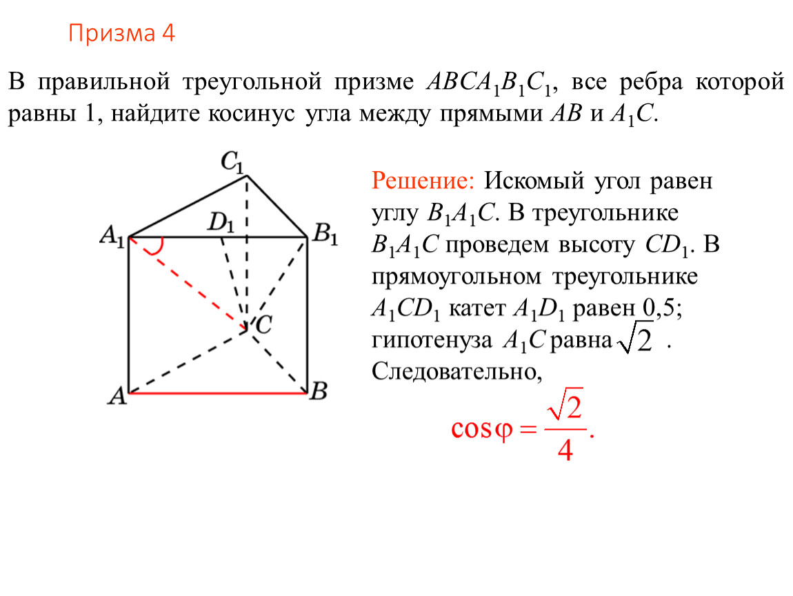 В правильной треугольной призме ABCA1B1C1, все ребра которой равны 1, найдите косинус угла между прямыми AB и A1C.