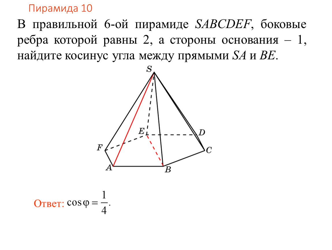 В правильной 6-ой пирамиде SABCDEF, боковые ребра которой равны 2, а стороны основания – 1, найдите косинус угла между прямыми SA и BE.