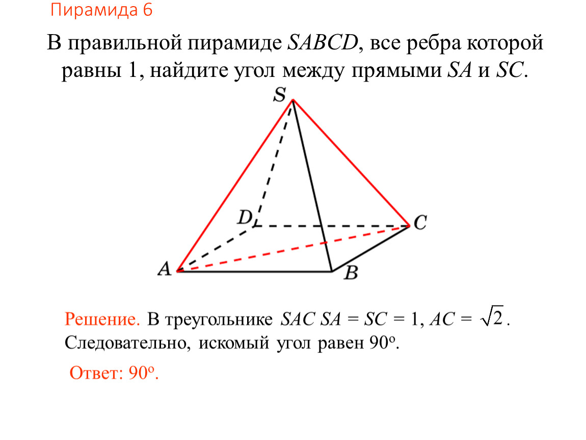 В правильной пирамиде SABCD, все ребра которой равны 1, найдите угол между прямыми SA и SC.