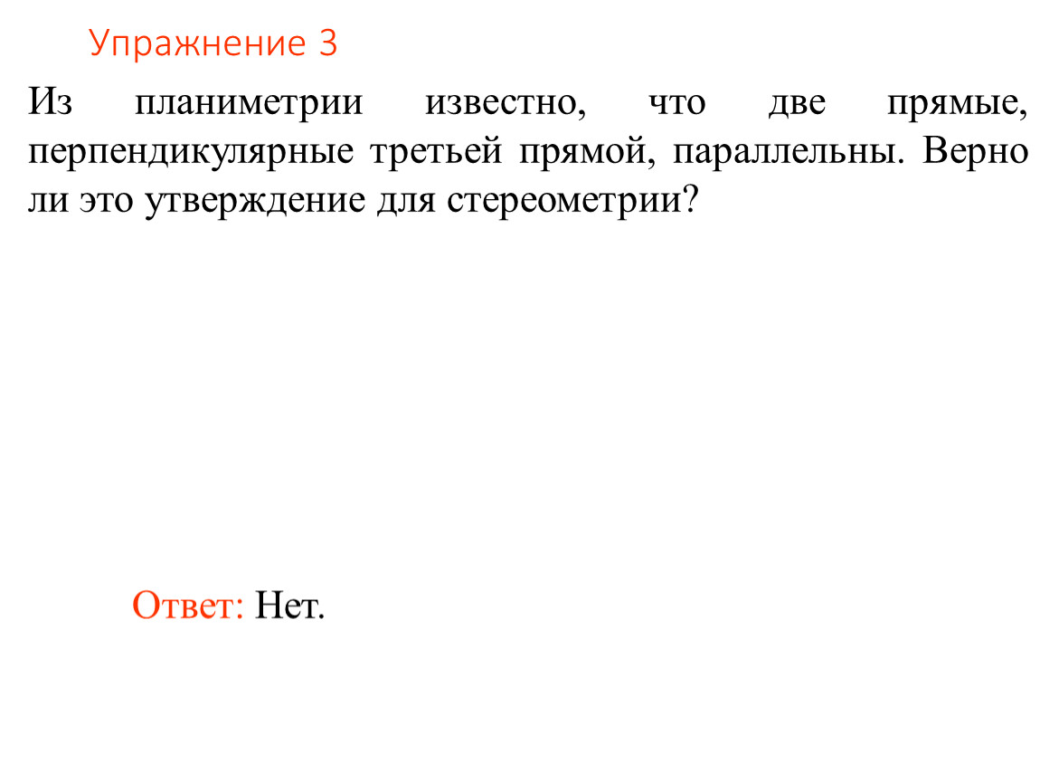Из планиметрии известно, что две прямые, перпендикулярные третьей прямой, параллельны. Верно ли это утверждение для стереометрии?