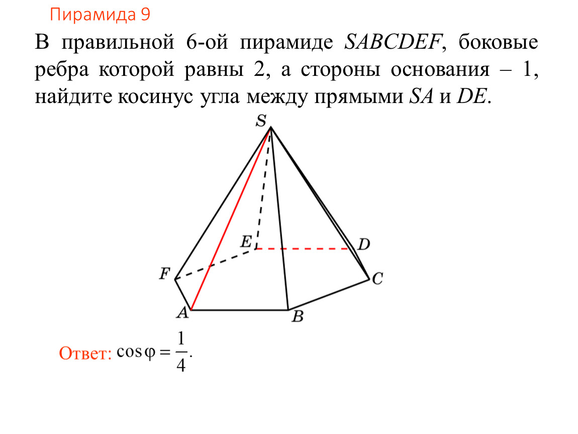 В правильной 6-ой пирамиде SABCDEF, боковые ребра которой равны 2, а стороны основания – 1, найдите косинус угла между прямыми SA и DE.