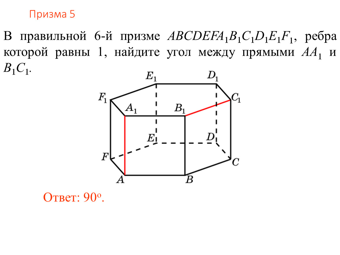 В правильной 6-й призме ABCDEFA1B1C1D1E1F1, ребра которой равны 1, найдите угол между прямыми AA1 и B1C1.