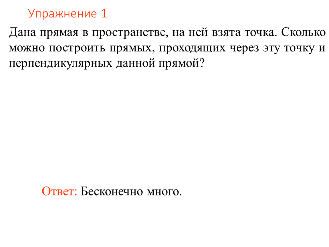 Дана прямая в пространстве, на ней взята точка. Сколько можно построить прямых, проходящих через эту точку и перпендикулярных данной прямой?