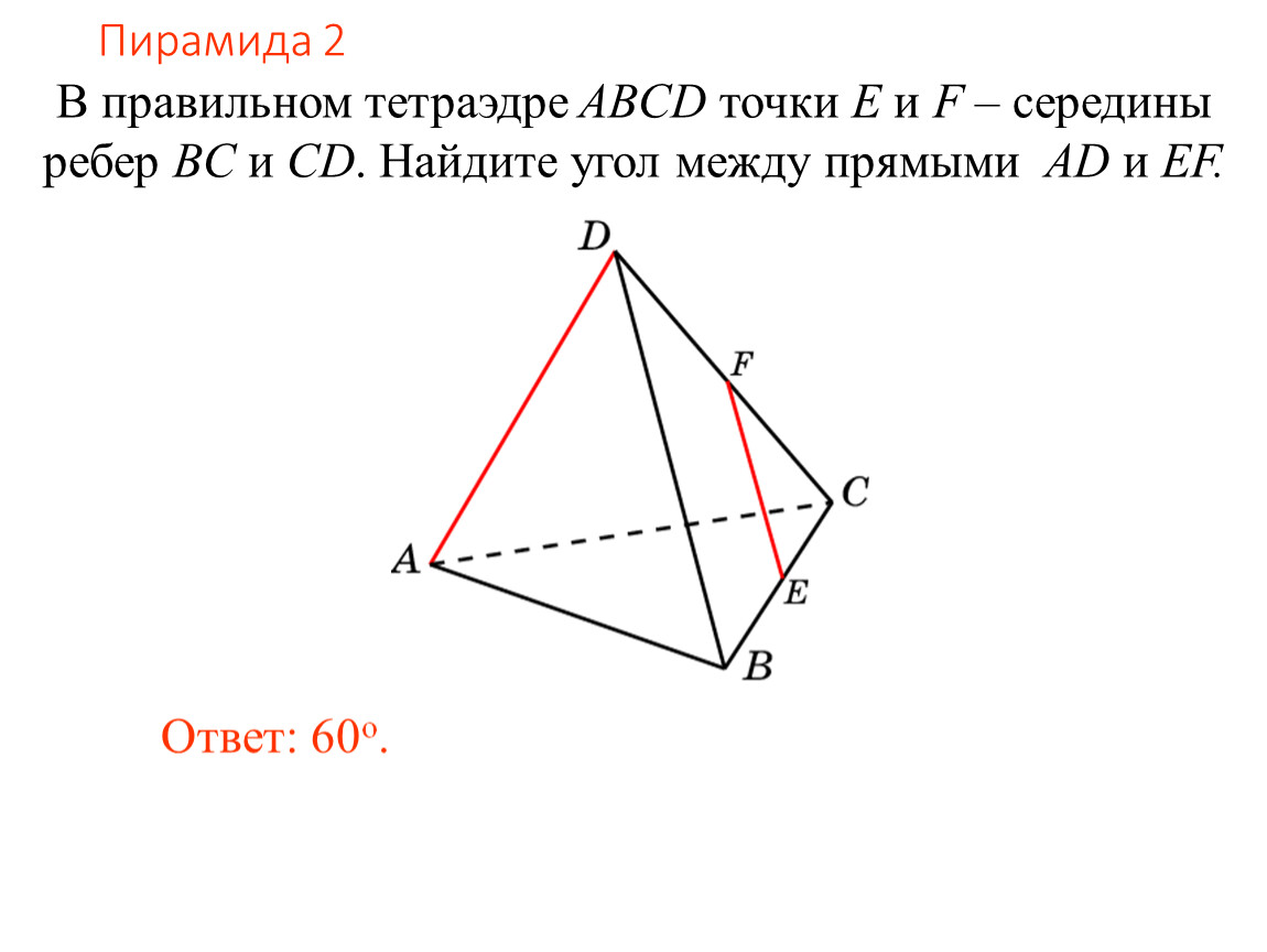 В правильном тетраэдре ABCD точки E и F – середины ребер BC и CD. Найдите угол между прямыми AD и EF.