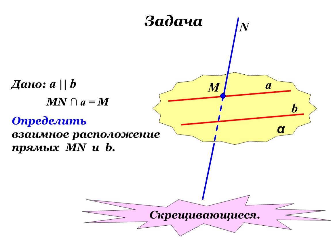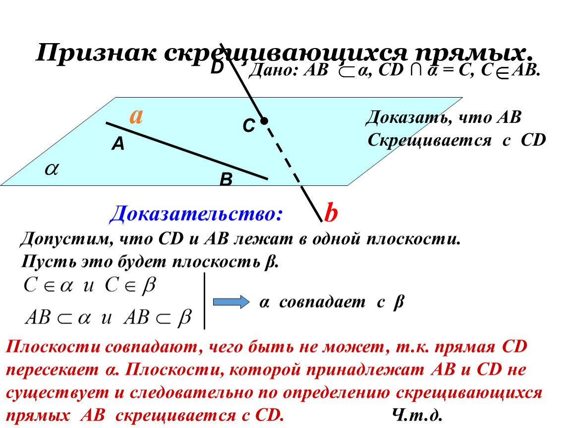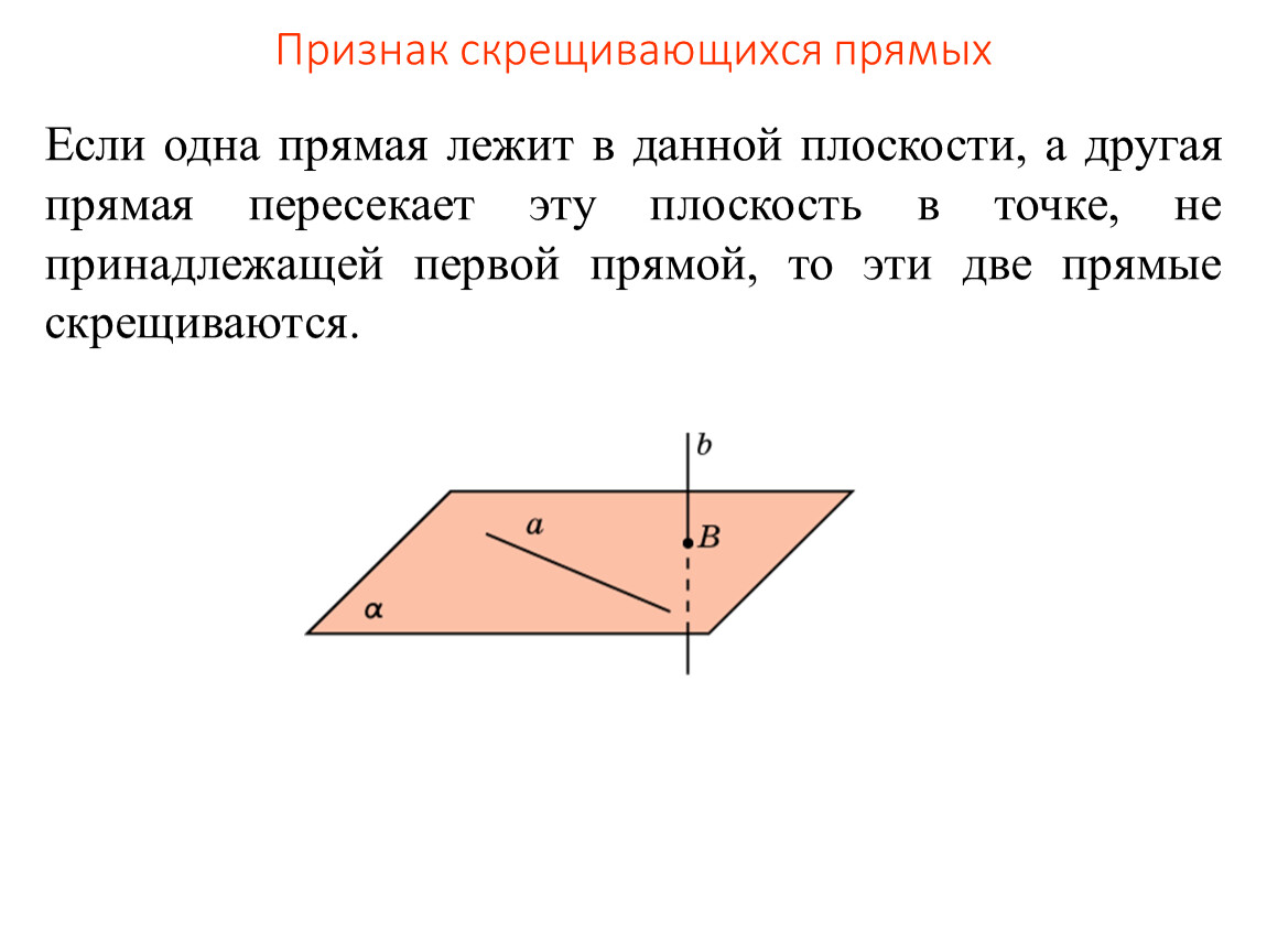 Если одна прямая лежит в данной плоскости, а другая прямая пересекает эту плоскость в точке, не принадлежащей первой прямой, то эти две прямые скрещиваются.