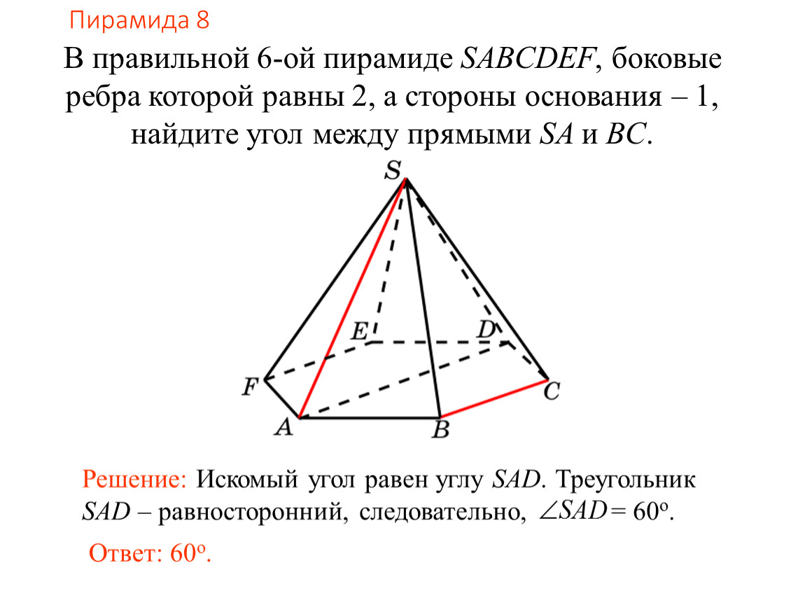 В правильной 6-ой пирамиде SABCDEF, боковые ребра которой равны 2, а стороны основания – 1, найдите угол между прямыми SA и BC.