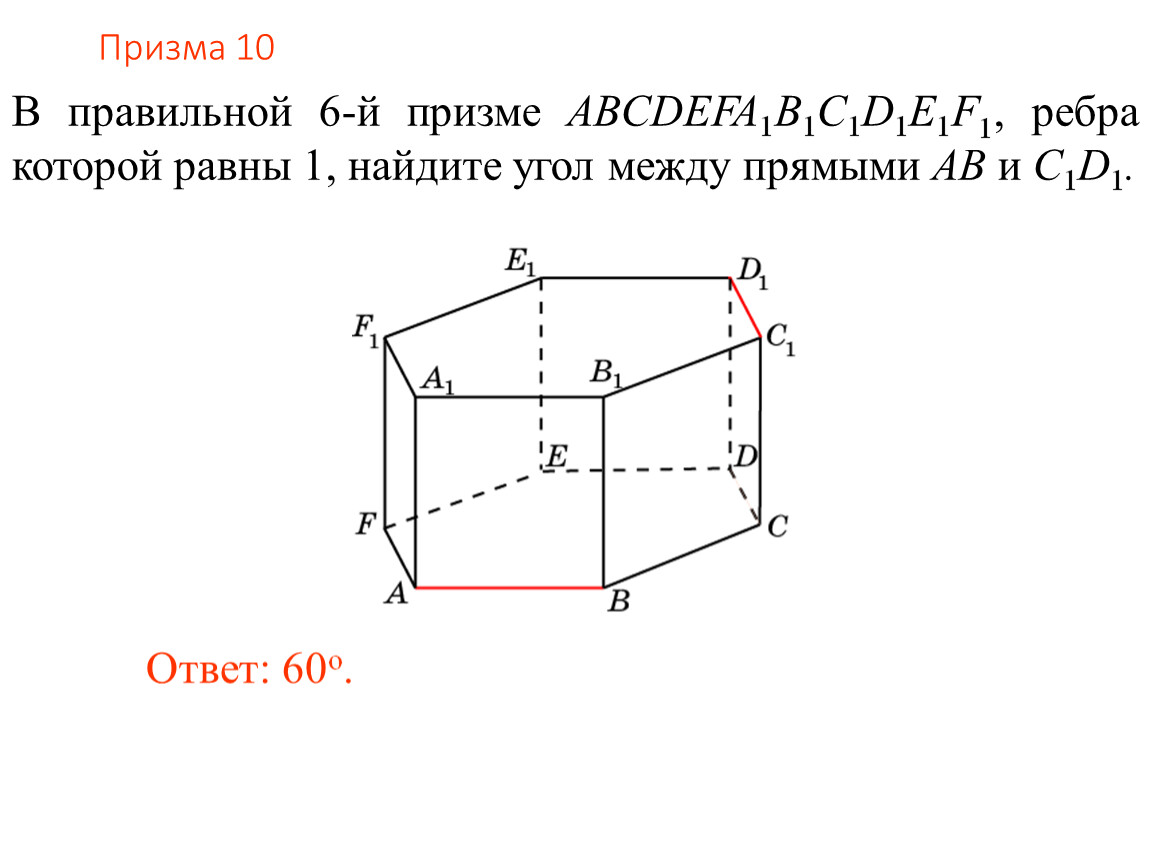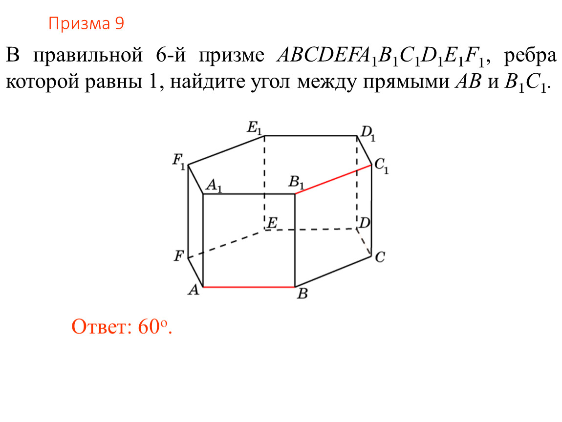 В правильной 6-й призме ABCDEFA1B1C1D1E1F1, ребра которой равны 1, найдите угол между прямыми AB и B1C1.