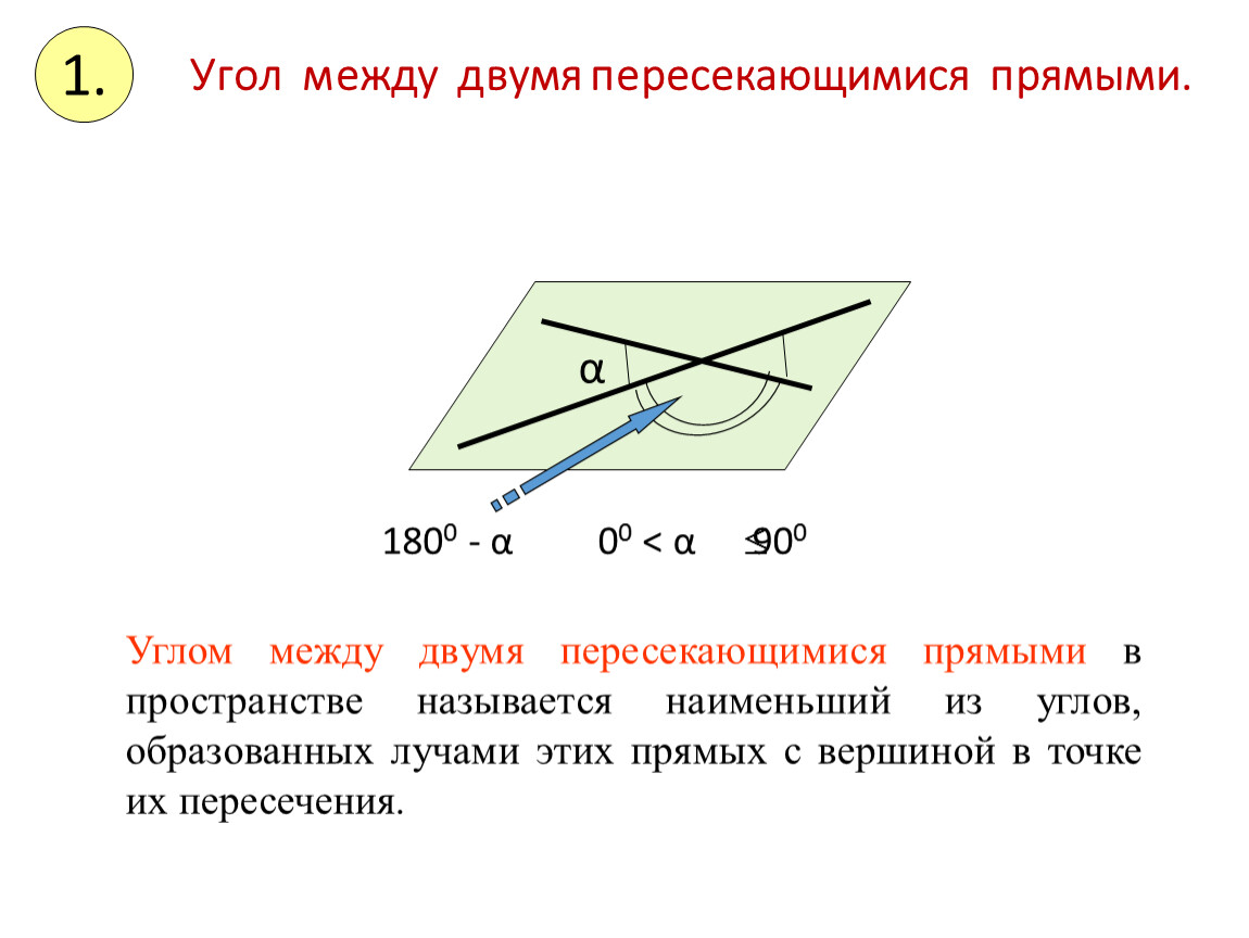 Углом между двумя пересекающимися прямыми в пространстве называется наименьший из углов, образованных лучами этих прямых с вершиной в точке их пересечения.