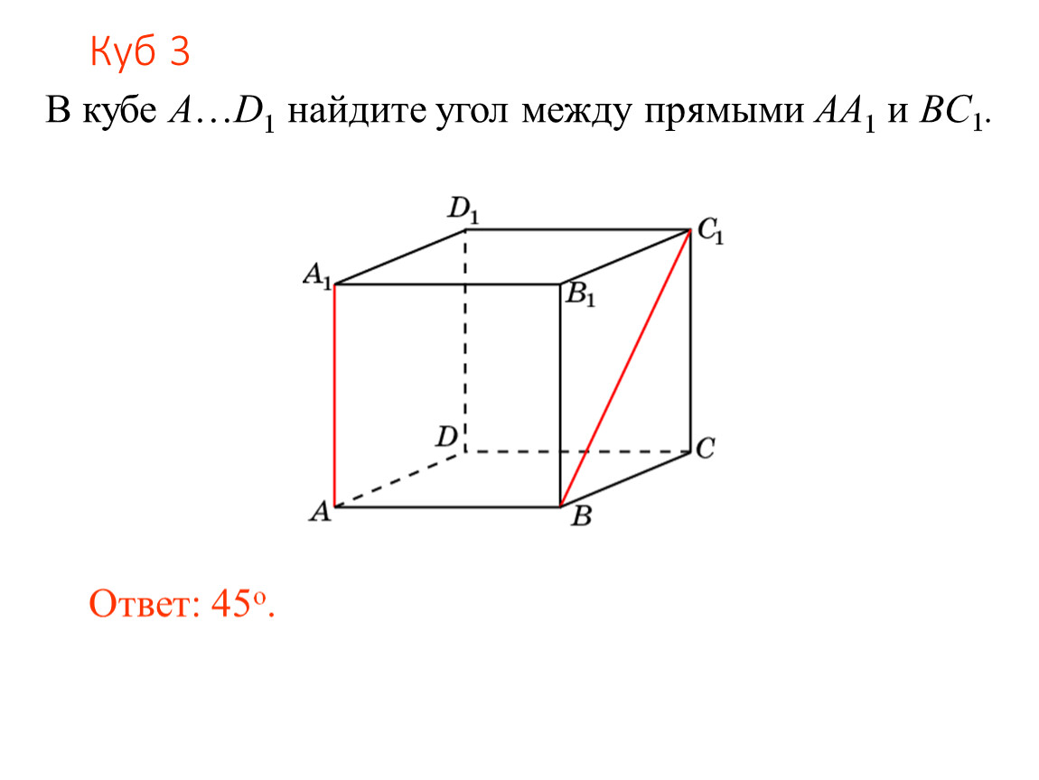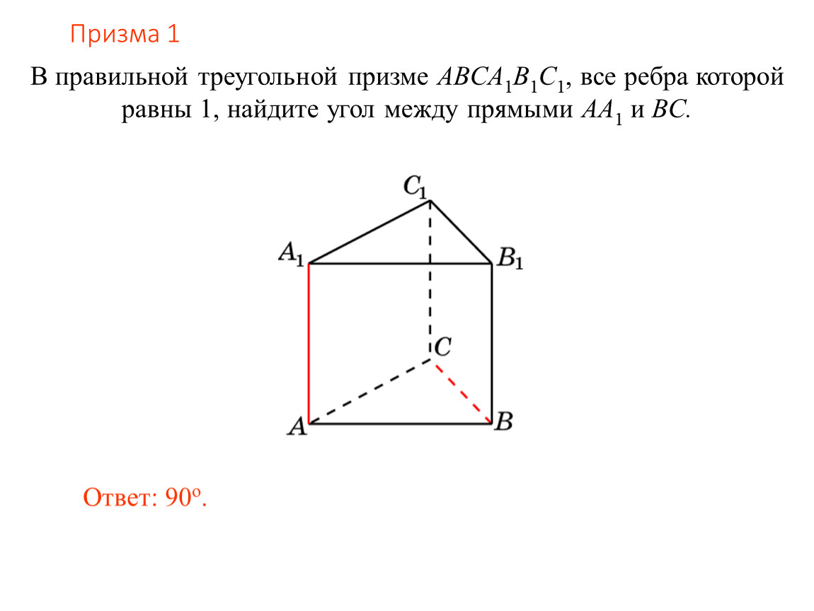 В правильной треугольной призме ABCA1B1C1, все ребра которой равны 1, найдите угол между прямыми AA1 и BC.