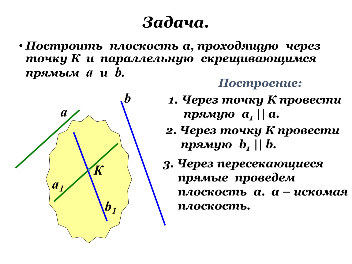 Построить плоскость α, проходящую через точку К и параллельную скрещивающимся прямым а и b.