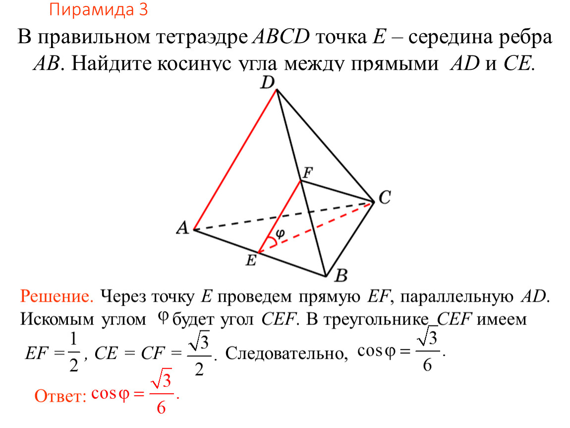В правильном тетраэдре ABCD точка E – середина ребра AB. Найдите косинус угла между прямыми AD и CE.