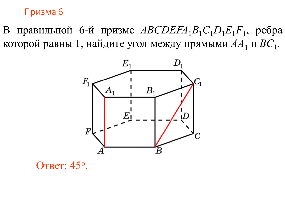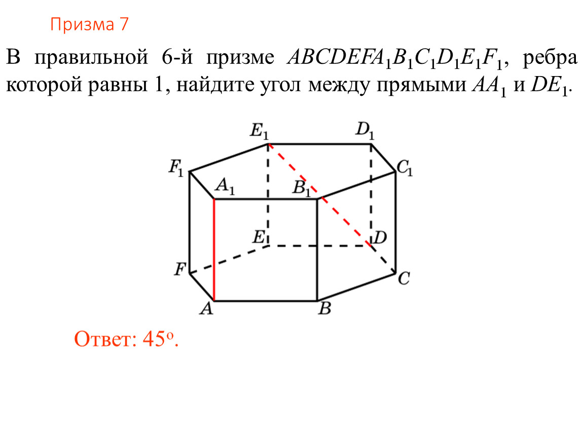 В правильной 6-й призме ABCDEFA1B1C1D1E1F1, ребра которой равны 1, найдите угол между прямыми AA1 и DE1.