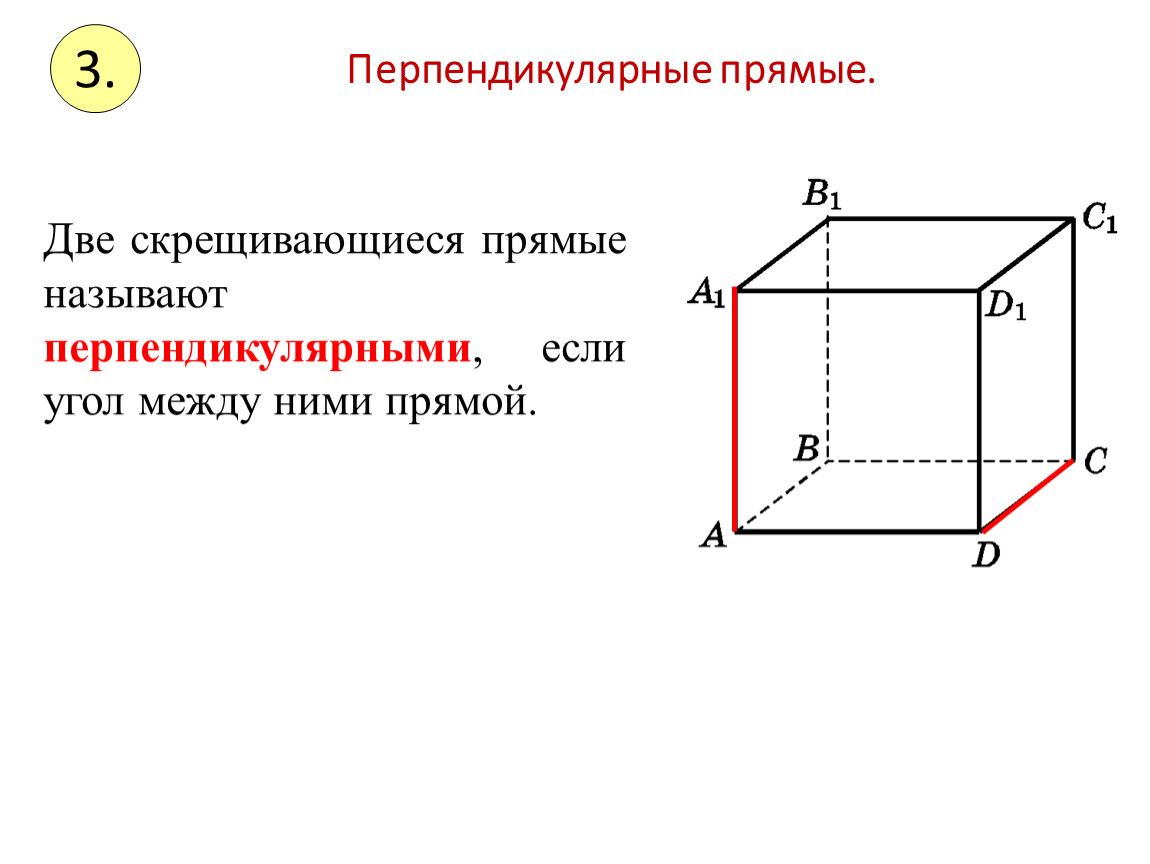 Две скрещивающиеся прямые называют перпендикулярными, если угол между ними прямой.