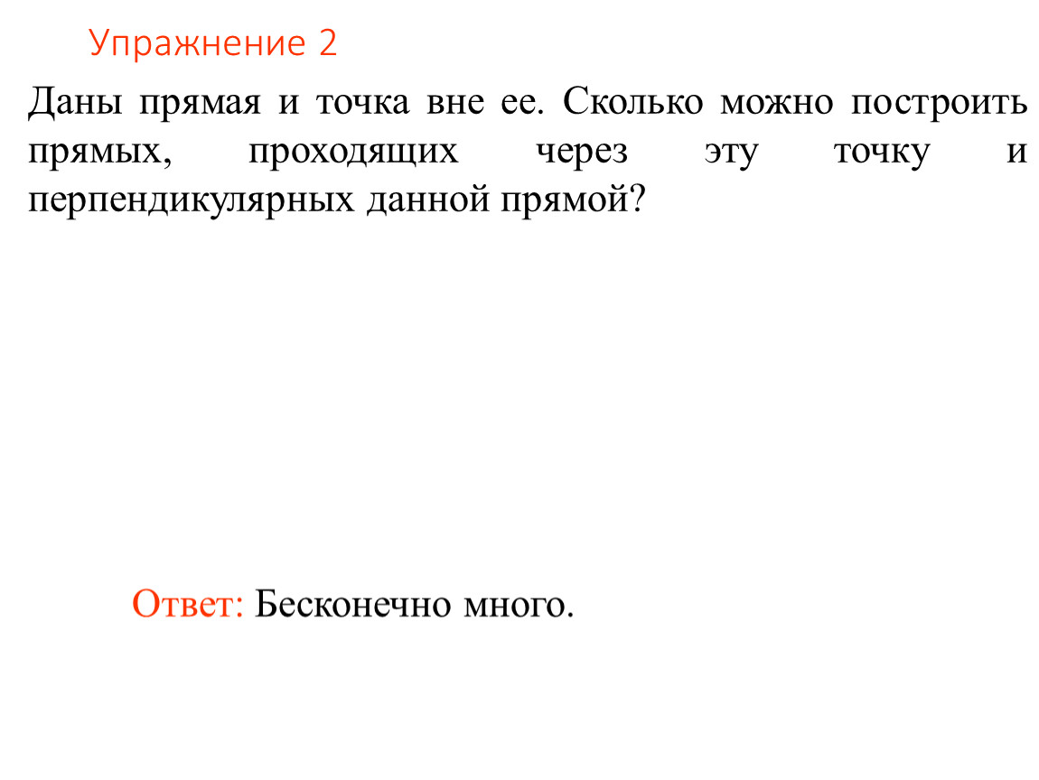 Даны прямая и точка вне ее. Сколько можно построить прямых, проходящих через эту точку и перпендикулярных данной прямой?
