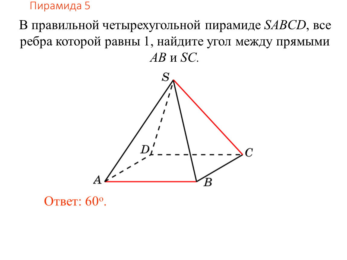 В правильной четырехугольной пирамиде SABCD, все ребра которой равны 1, найдите угол между прямыми AB и SC.