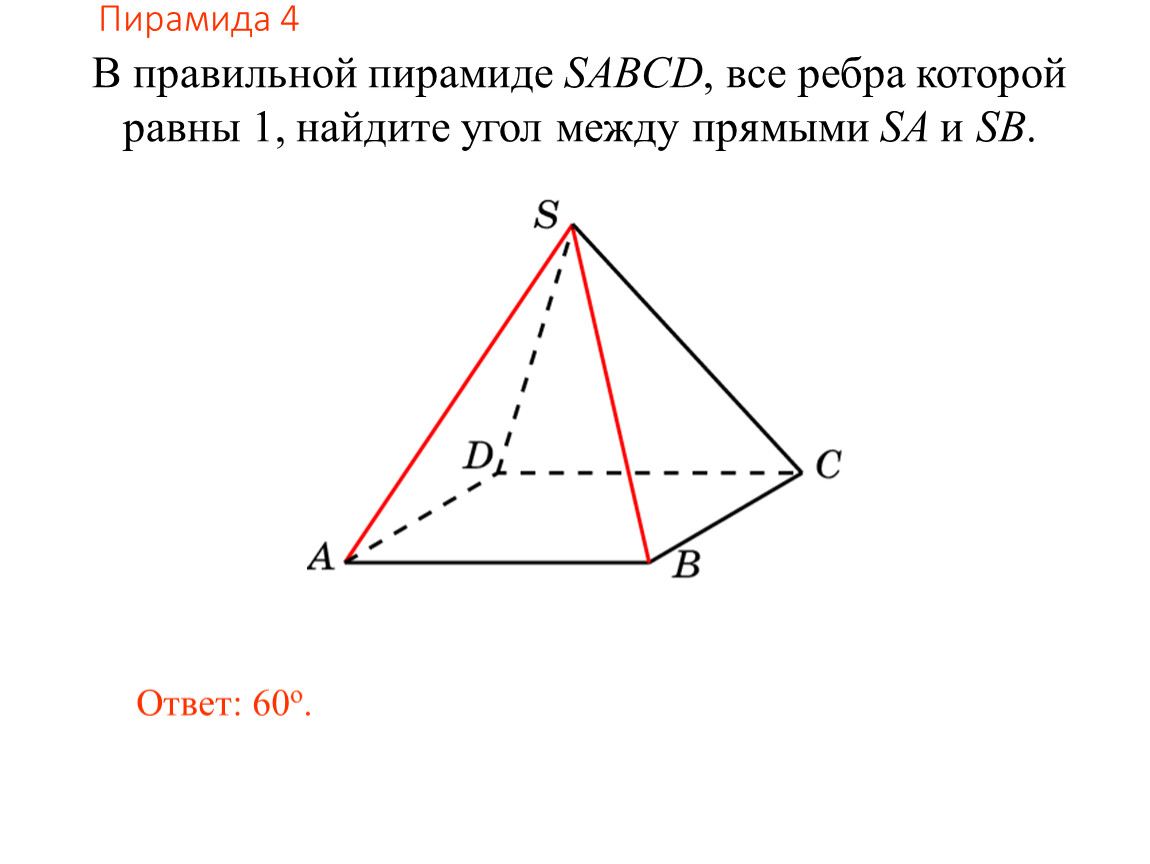 В правильной пирамиде SABCD, все ребра которой равны 1, найдите угол между прямыми SA и SB.