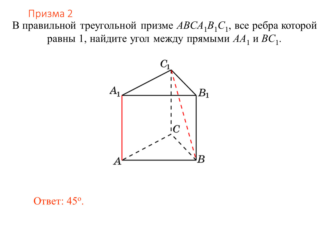 В правильной треугольной призме ABCA1B1C1, все ребра которой равны 1, найдите угол между прямыми AA1 и BC1.