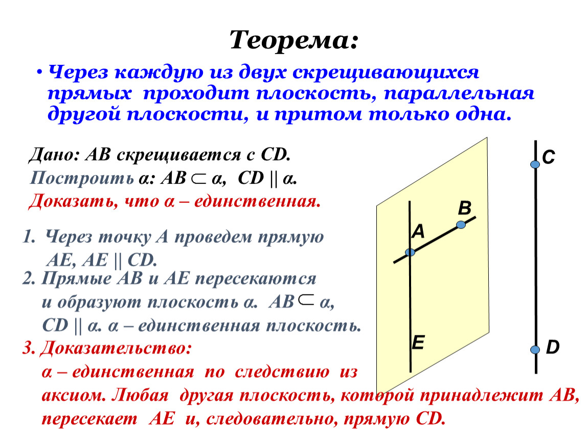 Через каждую из двух скрещивающихся прямых проходит плоскость, параллельная другой плоскости, и притом только одна.