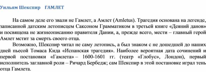 Возможно, Шекспир читал не саму летопись, а был знаком с не дошедшей до наших дней пьесой Томаса Кида «Испанская трагедия». Наиболее вероятная дата сочинений и первой постановки «Гамлета» – 1600-1601 гг. (театр «Глобус», Лондон), первый исполнитель заглавной роли – Ричард Бербедж; сам Шекспир в этой постановке играл тень отца Гамлета.